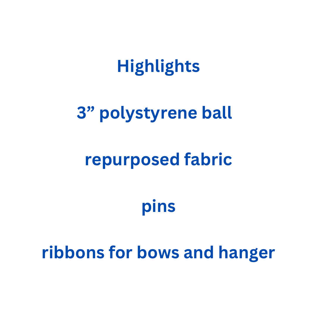 The fabrics may vary in design in future ornaments as the mission behind Earthwise Emporium is to repurpose high-quality fabrics.
