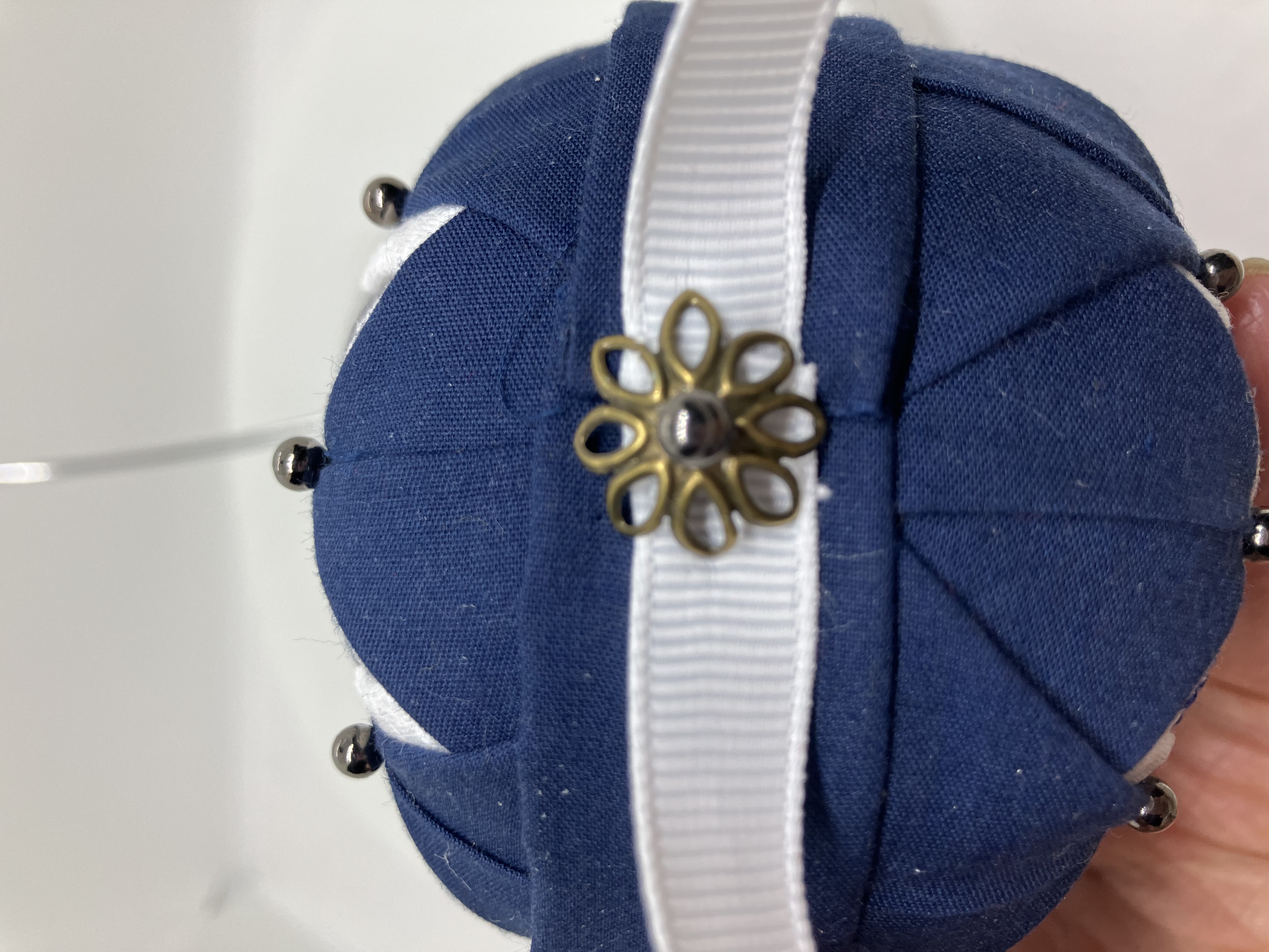 It is finished with bows and a hanger which are also held on with a pin but with a decorative metal-head.