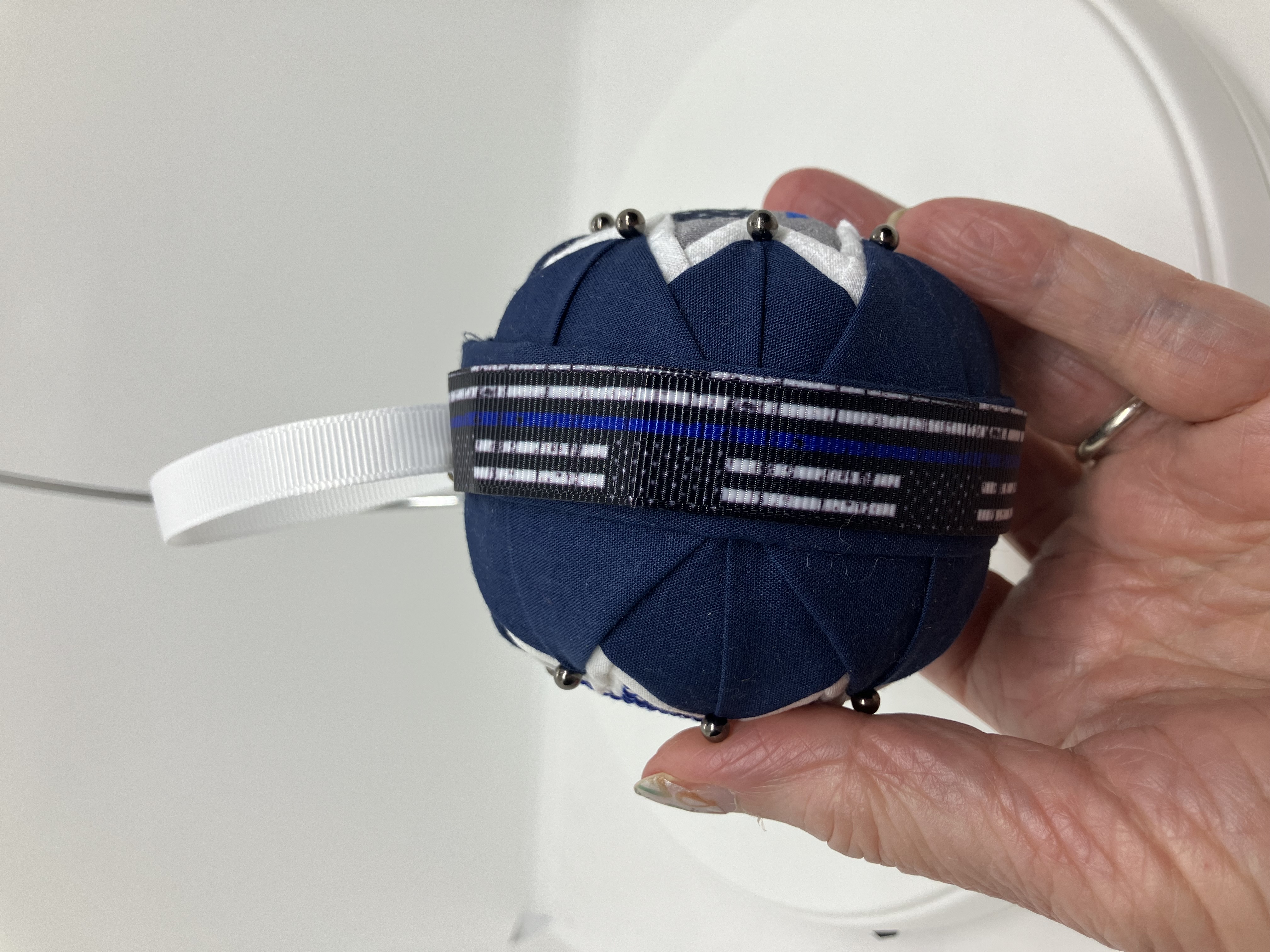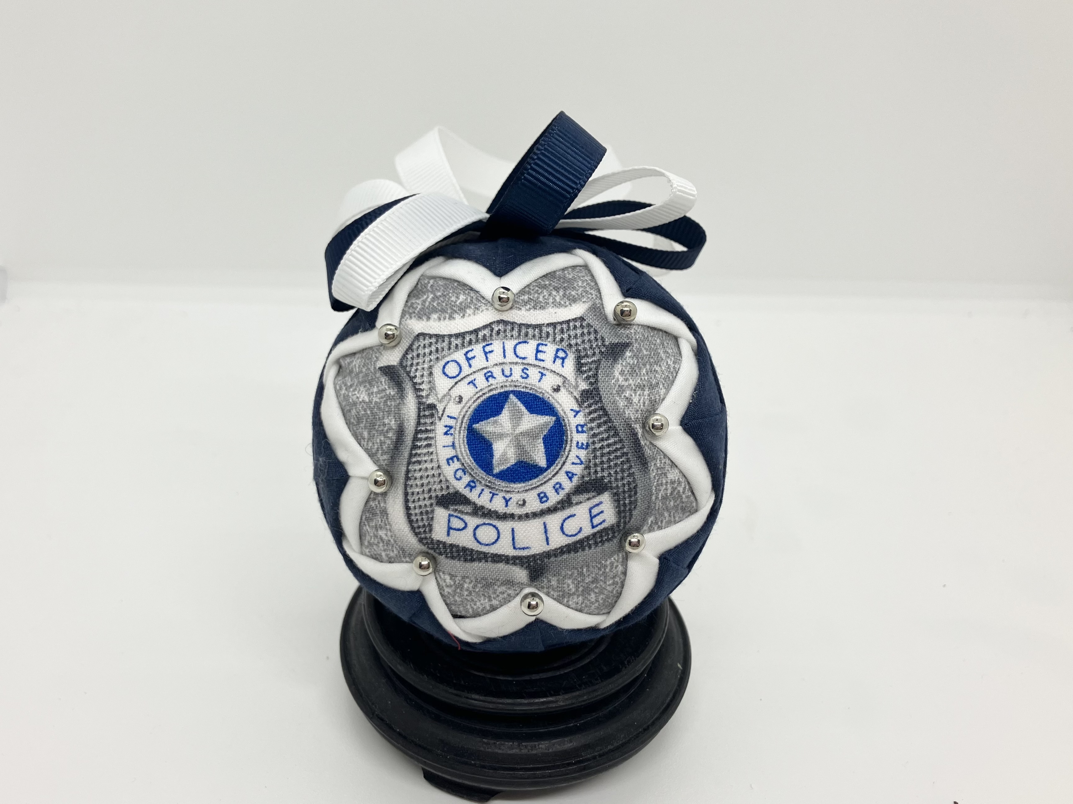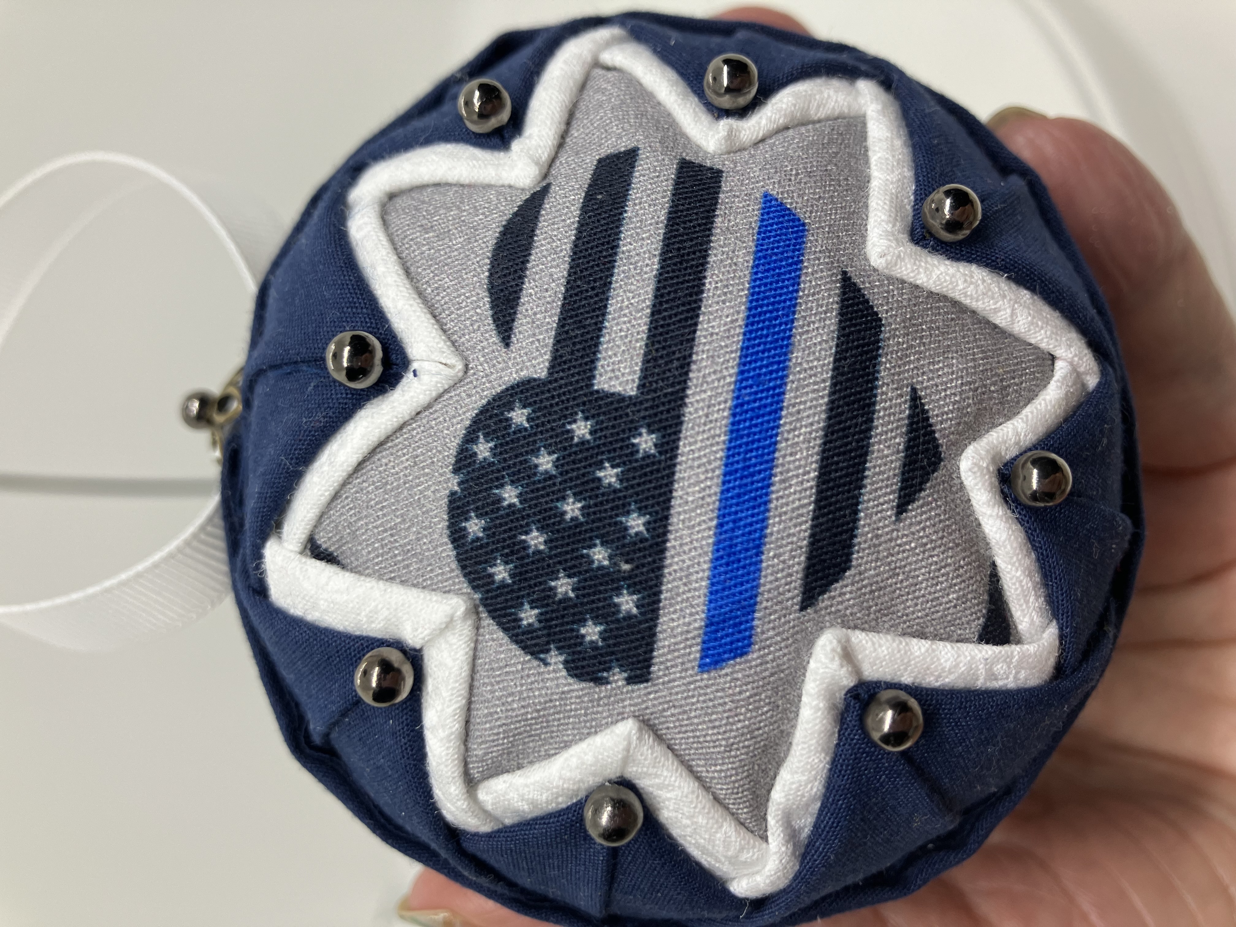 Back the Blue ornaments are made with high-quality repurposed fabrics and with great attention paid to details. Metal-head pins may use for embellishment