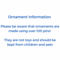 Ornaments are also made with pins and a polystyrene shapes. Because of the pins, ornaments are not toys and should be kept away from children and pets.