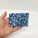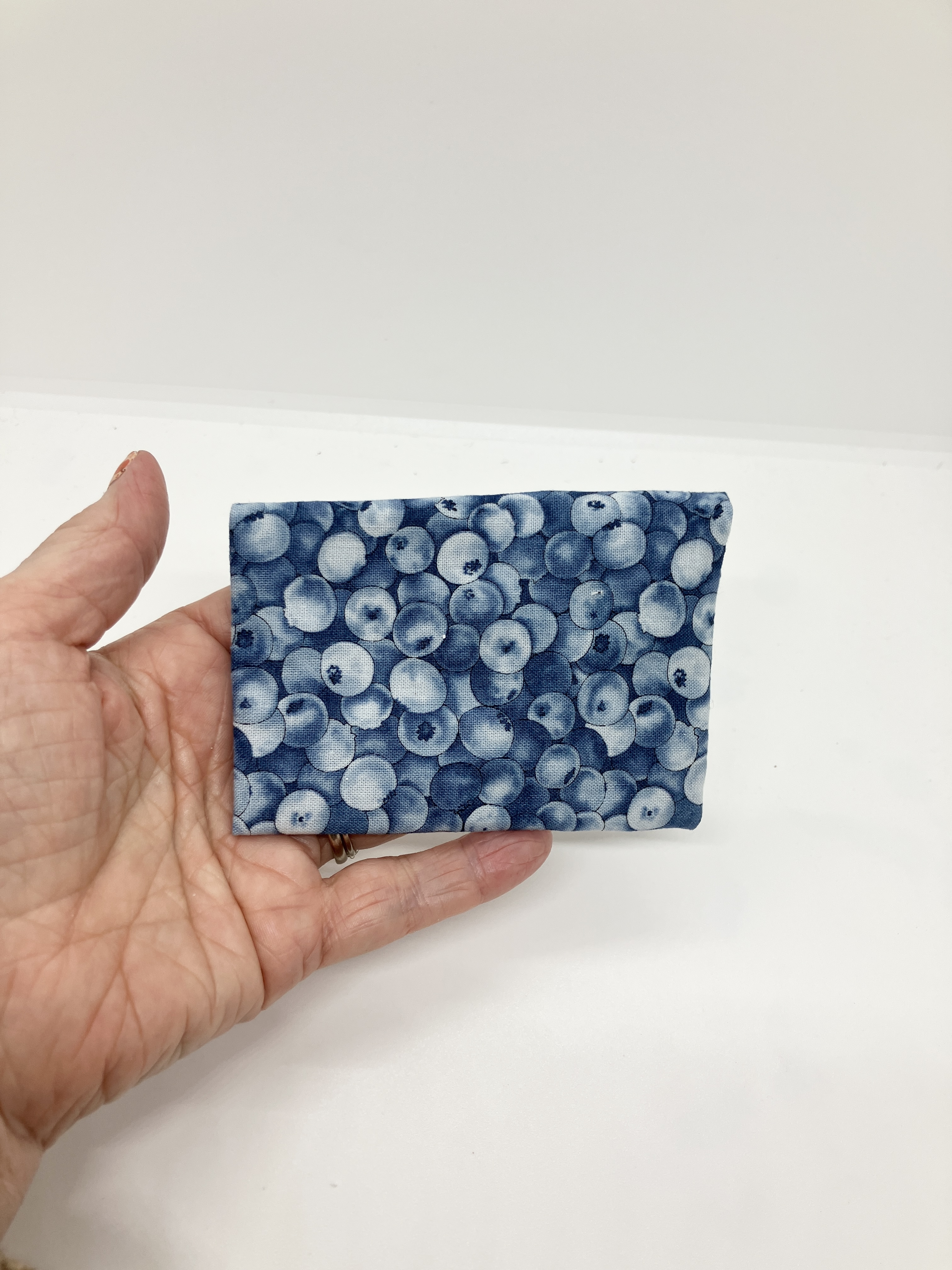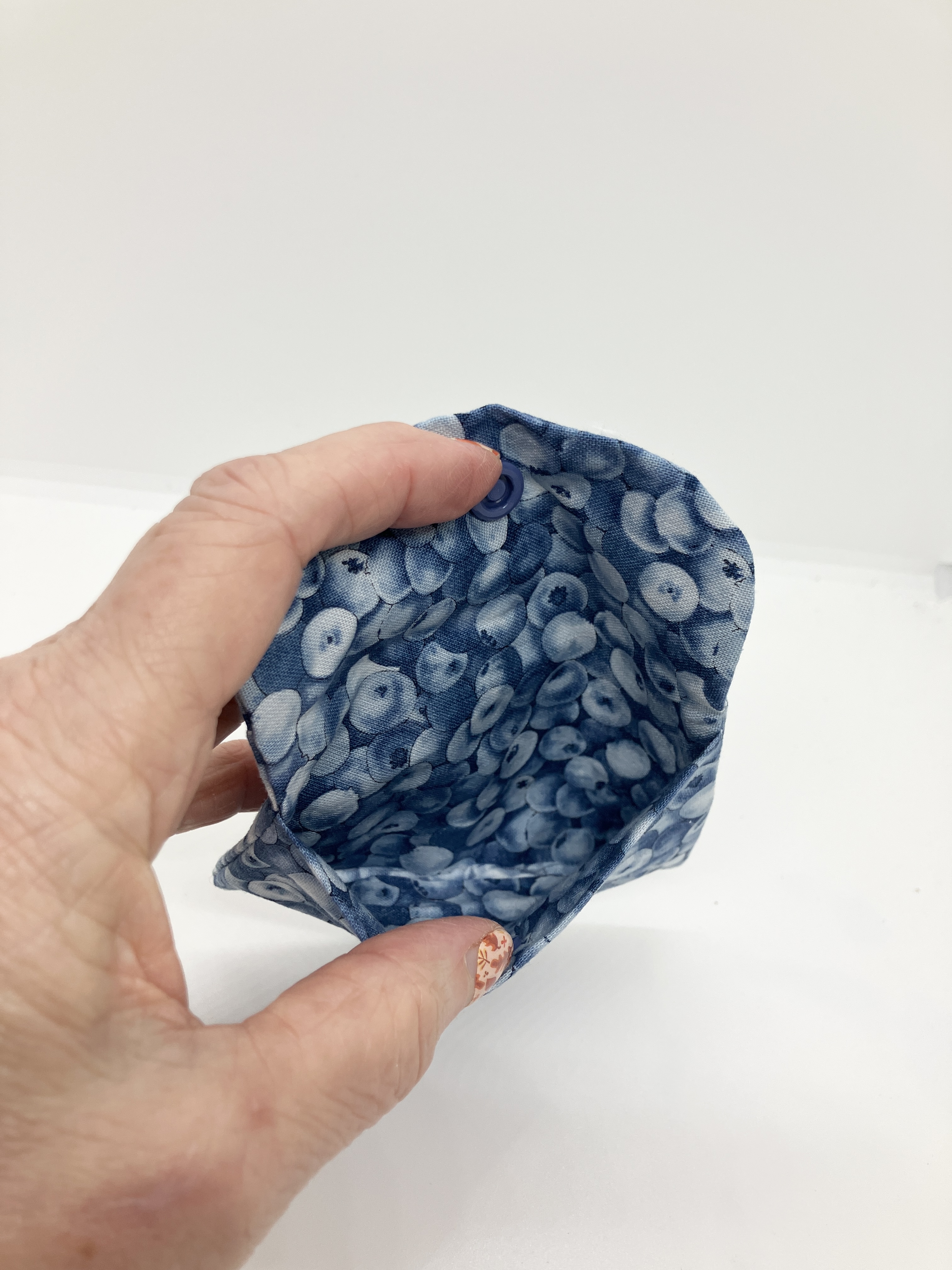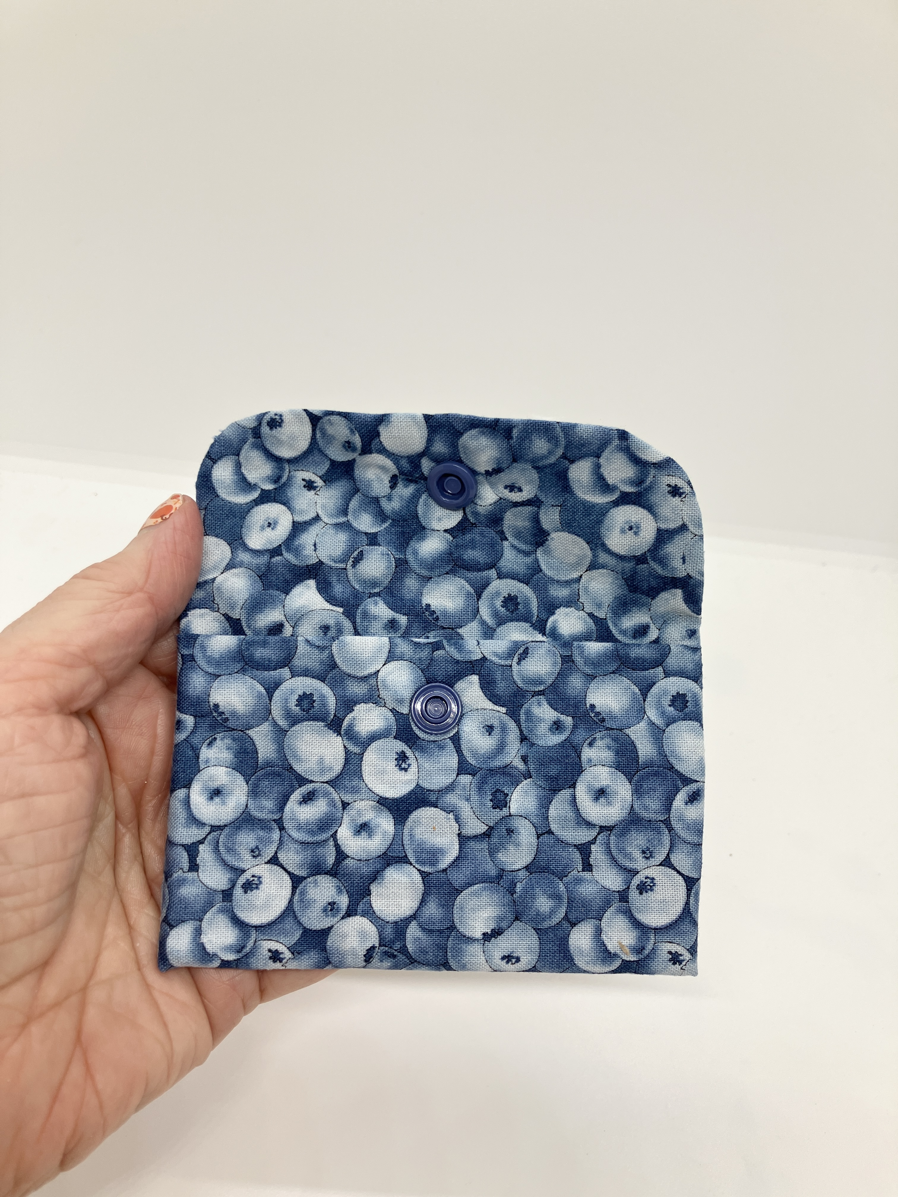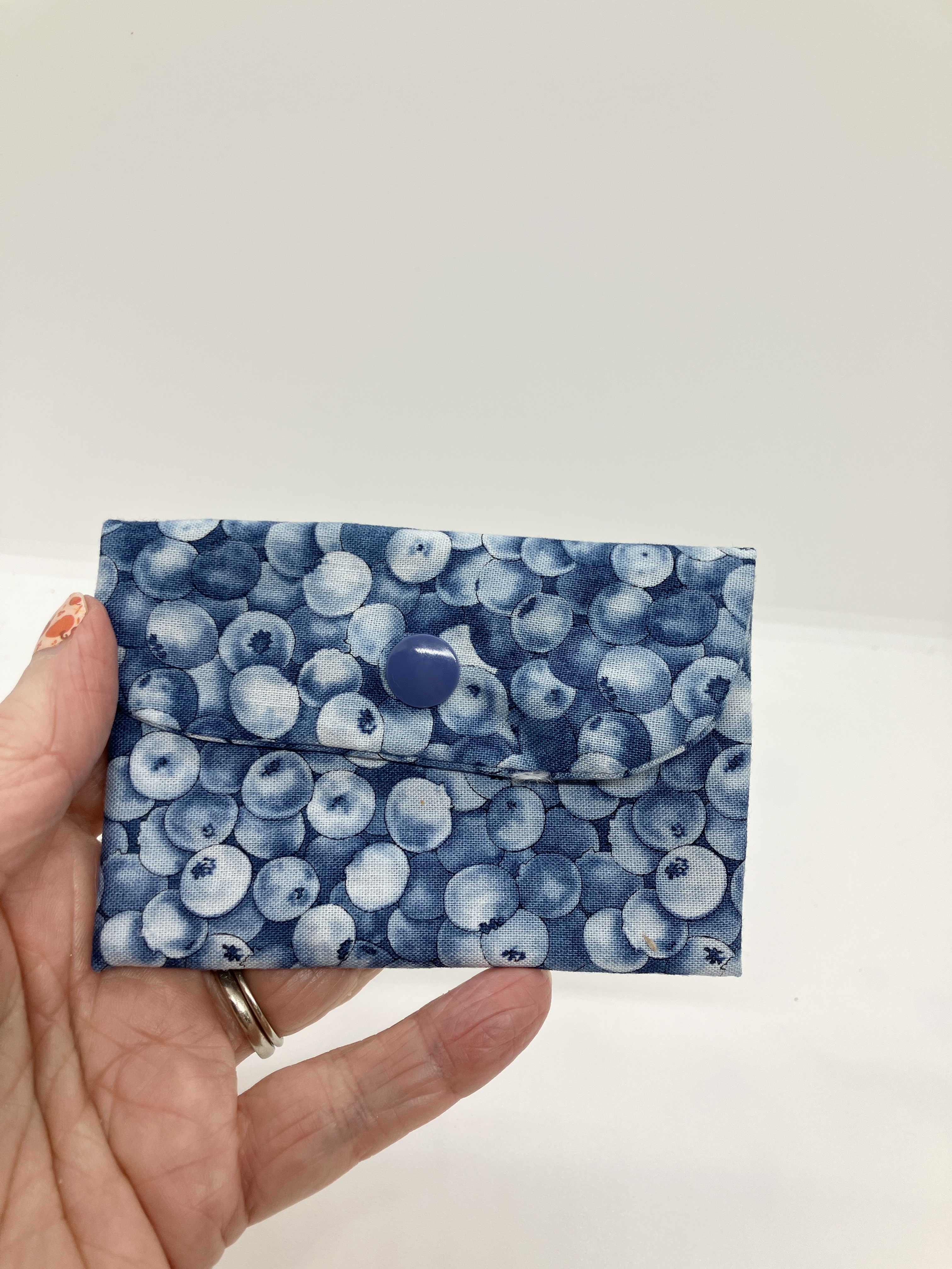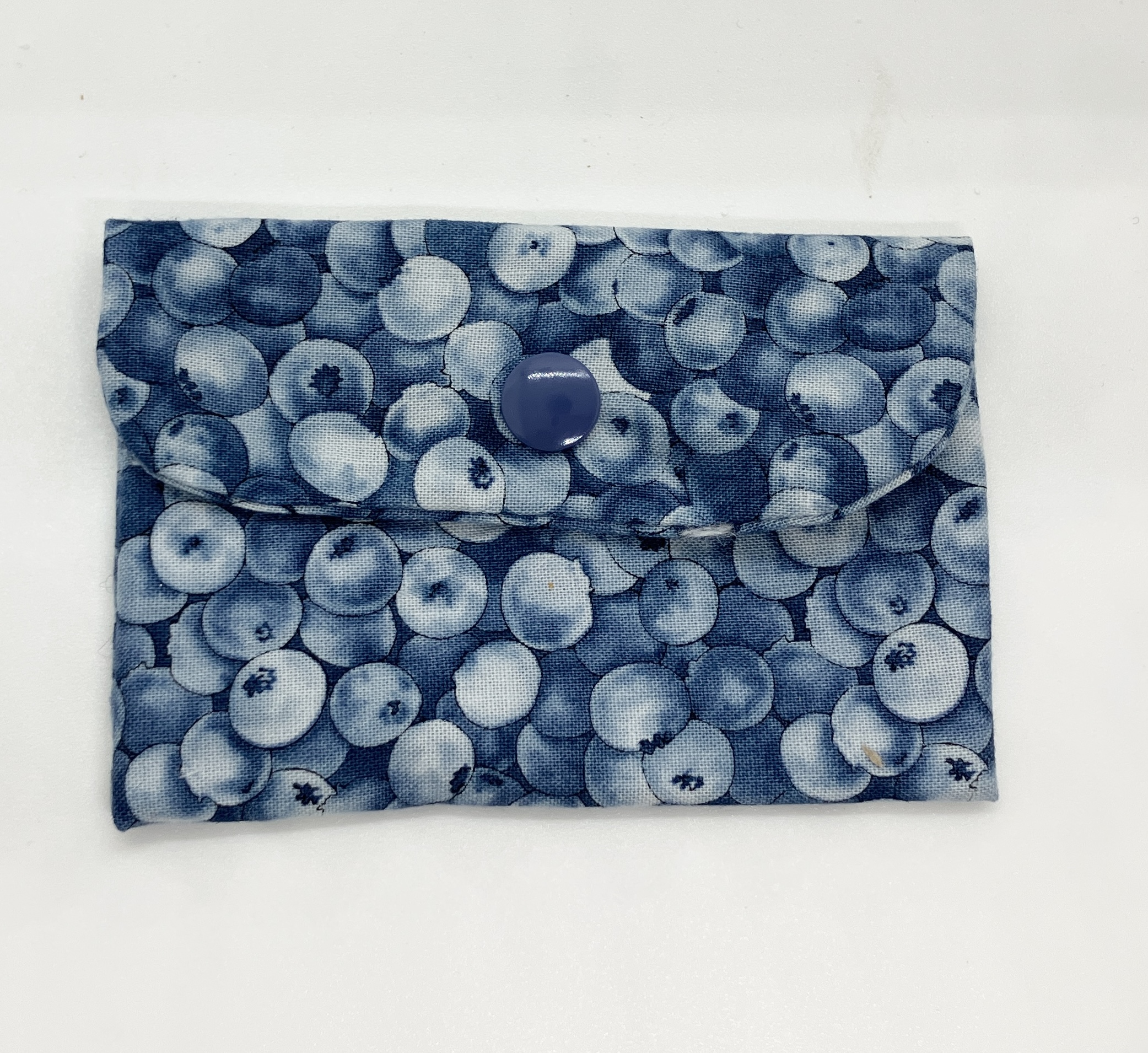 Blueberry mini wallet with snap closure.