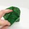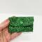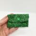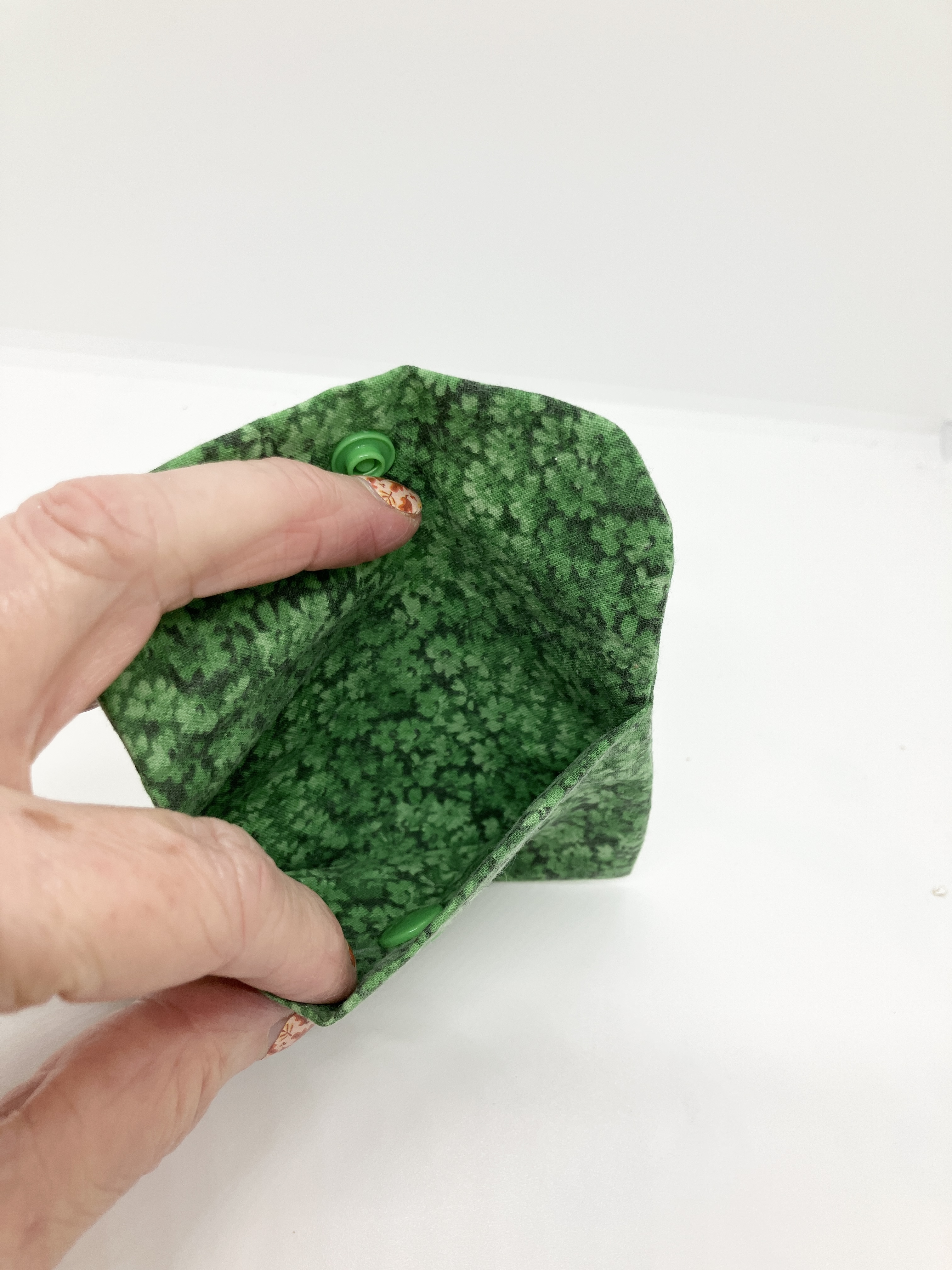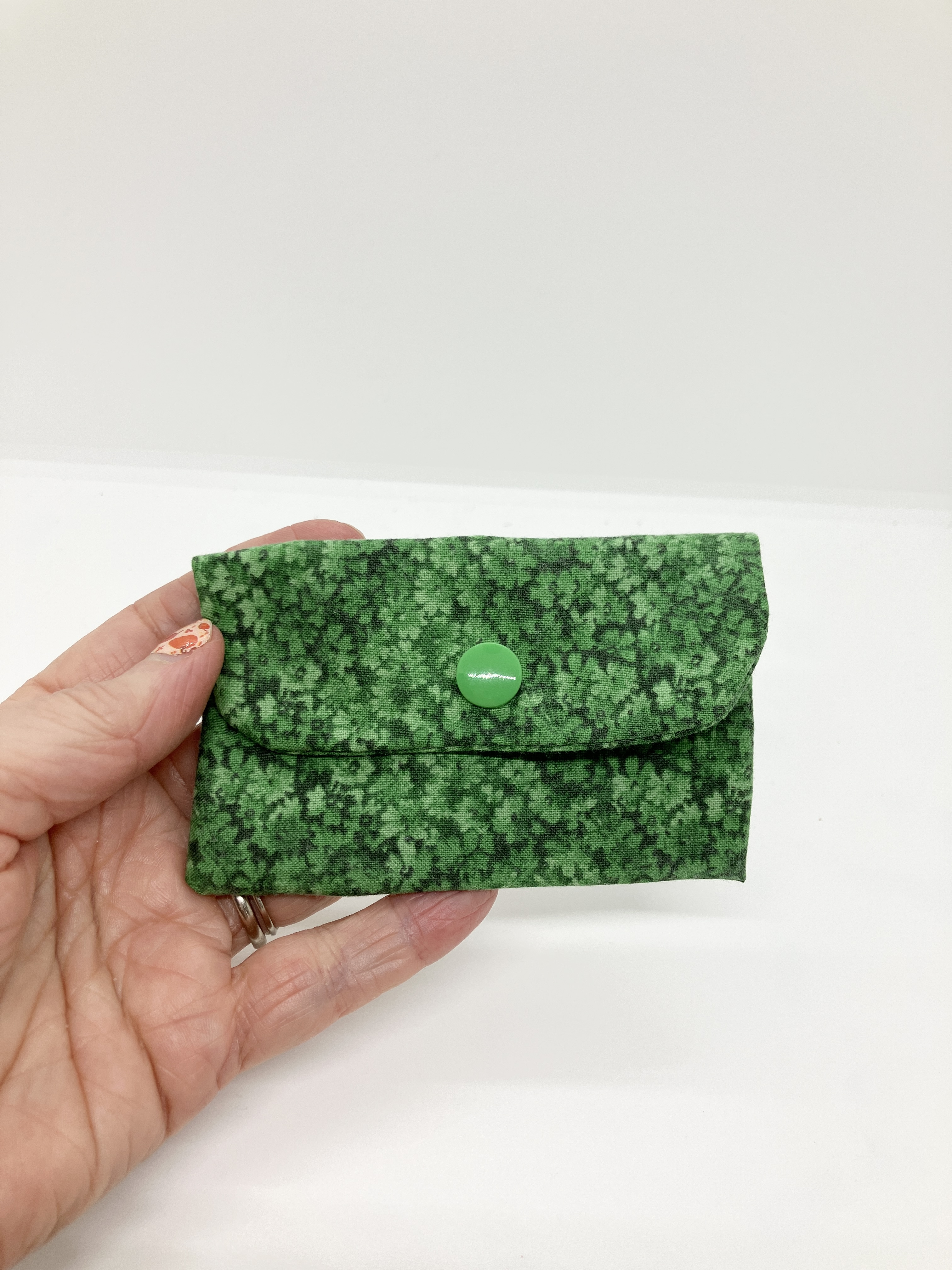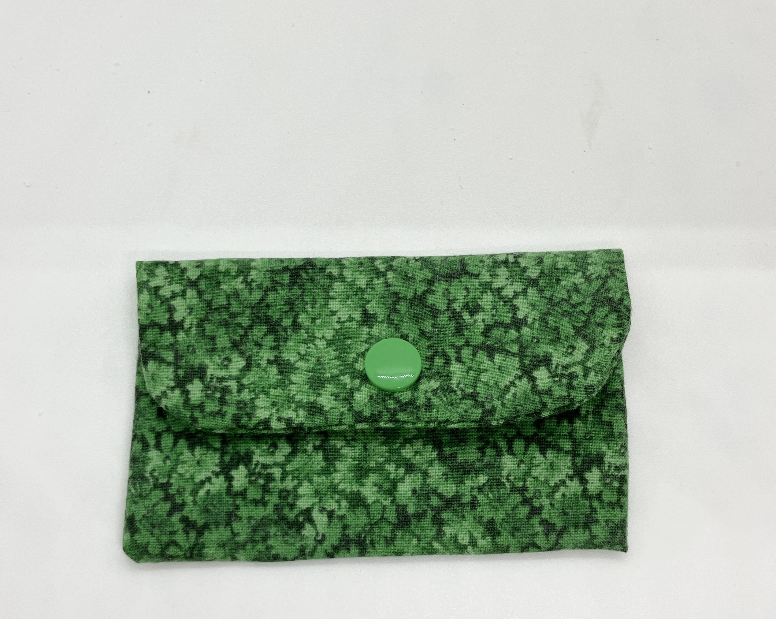 Green calico mini wallet with snap closure.