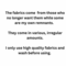 A 1. Fabric that has come from people who are clearing out their fabric stash because they don't want to throw it away and end up in the landfill when it's in perfectly good condition. I use my own remnants from my own sewing. All fabric is washed before being made into something new.